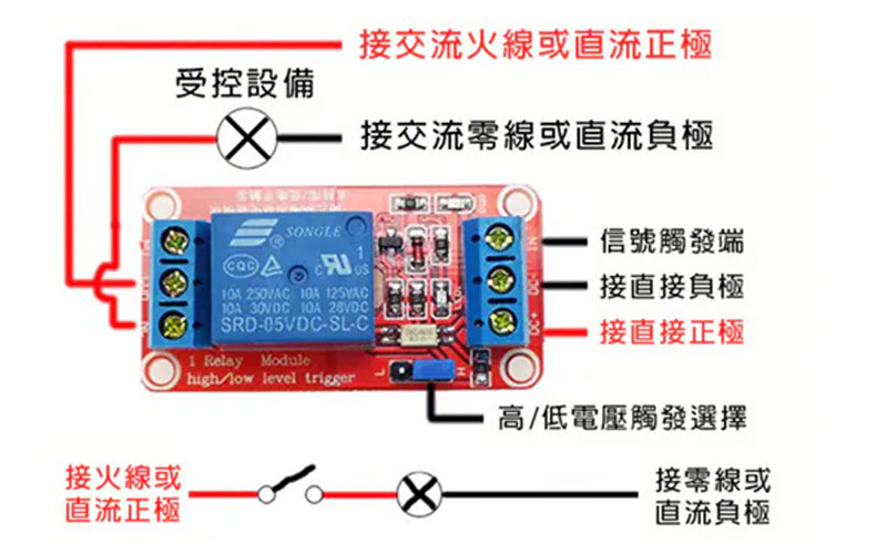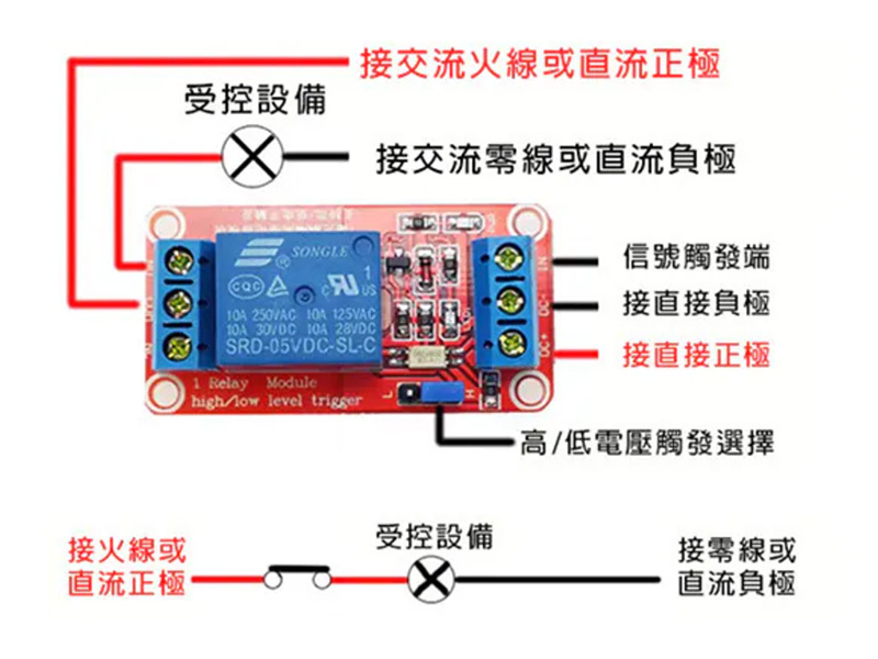 當訊號觸發端有高或低電壓訊號時(按設置功能),繼電器吸合,相當於開關閉合,此時電路接通,設備將有電正常工作