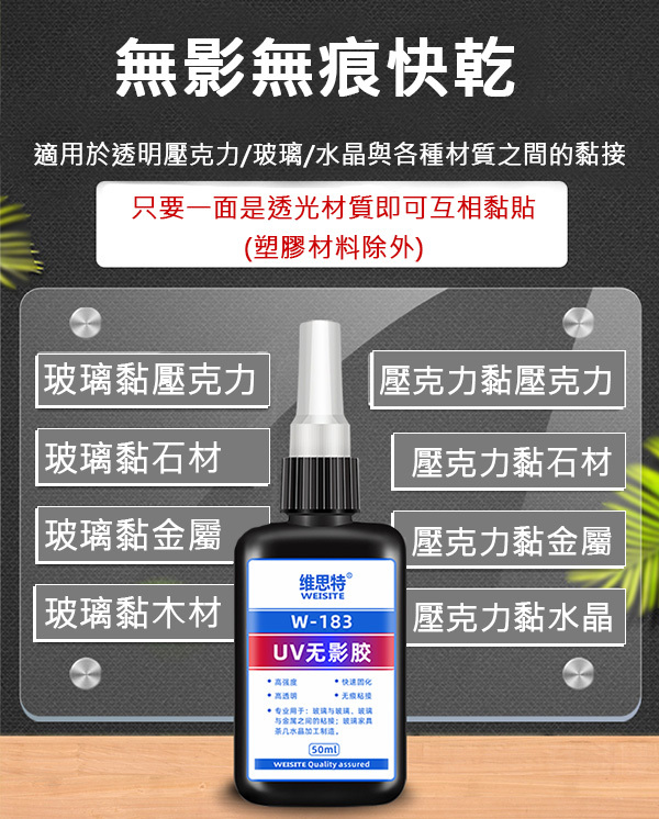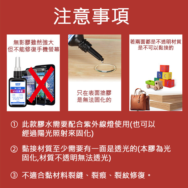 【注意】UV膠不適用於透明材質和塑膠材質的黏貼