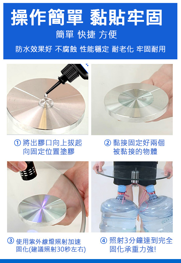 【注意】無影膠必須要紫外線照射才能固化,紫外線要從透明的那一面照射,否則無法穿透物體起到固化作用