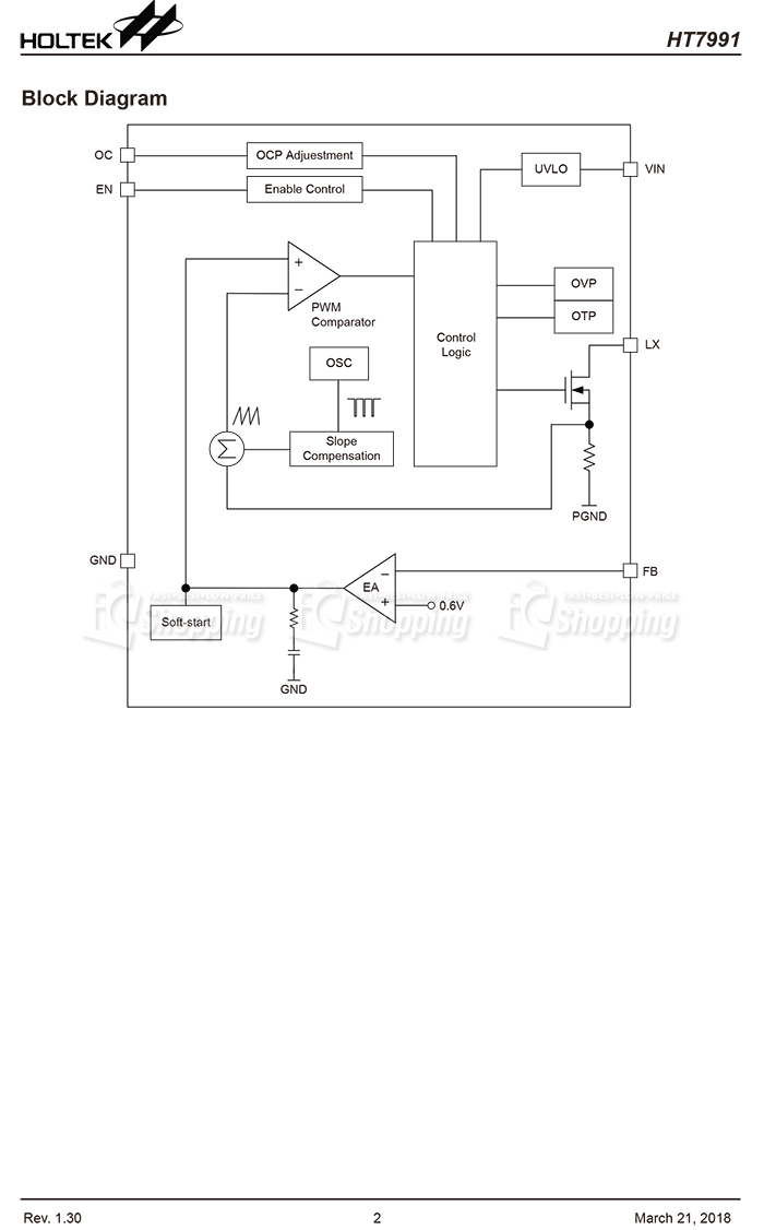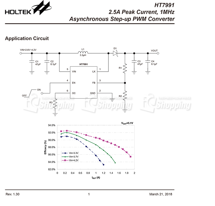 The HT7991 is a current mode asynchronous step-up DC-DC converter. The fully integrated power MOSFET transistor, with its 0.2Ω drain source resistance, ensures a high level of device power efficiency. A fixed 1MHz switching frequency has been chosen to permit smaller inductors to be used in the application circuit. The error amplifier non-inverting input amplifier is connected to an internal precision 0.6V/±2% reference voltage while an integrated soft-start function reduces the inrush current during the converter start up period. The device is available in a SOT23-6 package type.