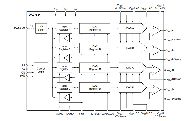 DAC7644 是一款 16 位元四路電壓輸出數位類比轉換器,可在指定溫度範圍內保證 15 位元單調性能。它接受 16 位元並行輸入數據,具有雙緩衝 DAC 輸入邏輯(允許同時更新所有 DAC),並提供內部輸入暫存器的回讀模式。可程式非同步重設將所有暫存器清除為中間刻度代碼 8000H 或零刻度 0000H。 DAC7644 可以採用 +5V 單電源或 +5V 和 –5V 電源供電。每個 DAC 的低功耗和小尺寸使 DAC7644 成為自動測試設備、每個引腳 DAC 程式設計器、資料擷取系統和閉環伺服控制的理想選擇。 DAC7644 採用 48 腳 SSOP 封裝,並在 –40°C 至 +85°C 溫度範圍內提供保證的規格。