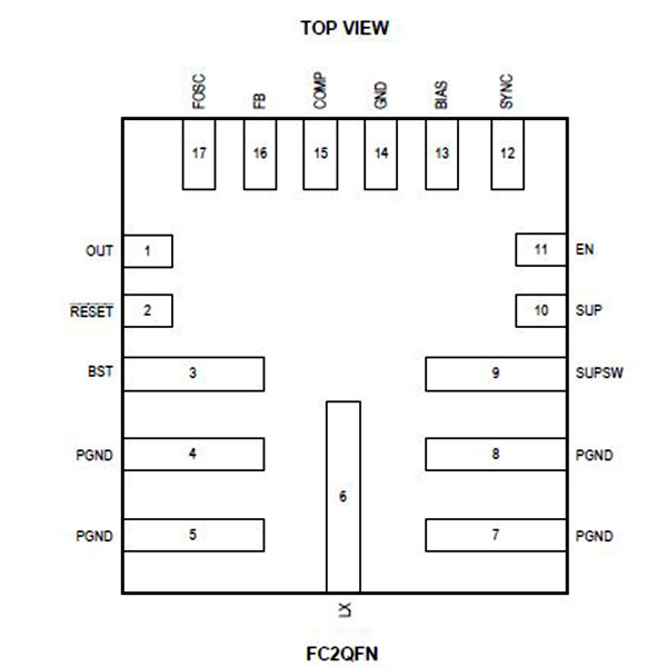 | 12 | SYNC | Connect SYNC to GND or leave unconnected to enable skip-mode operation under light loads. Connect SYNC to BIAS or to an external clock to enable fixed-frequency forced-PWM-mode operation. When driving SYNC externally, do not exceed the BIAS or OUT voltage. |