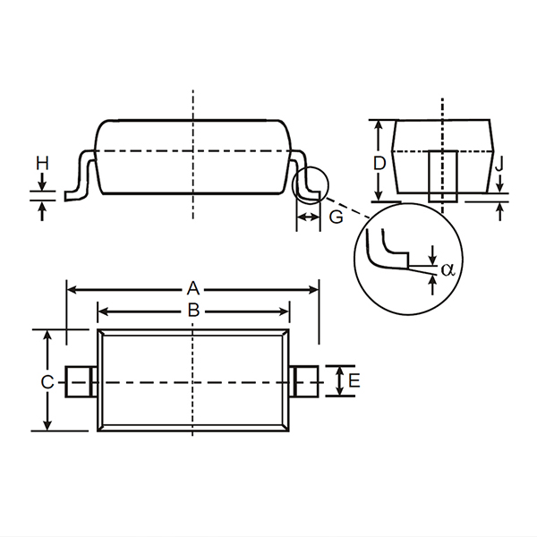 | Dim | A | B | C | D | E | G | H | J | α | |