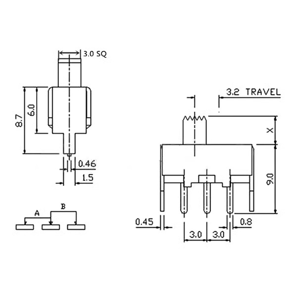 3P 滑動開關小 2 段 180 度(帶耳)為通用型板上安裝開關,具雙段切換設計,操作流暢、定位清晰。採高耐用接點結構與固定耳支撐,提升安裝穩定性與抗振性能。適用於小型電子產品、控制電路及 DIY 電子開關應用,可作為模式切換或電源控制用途。
