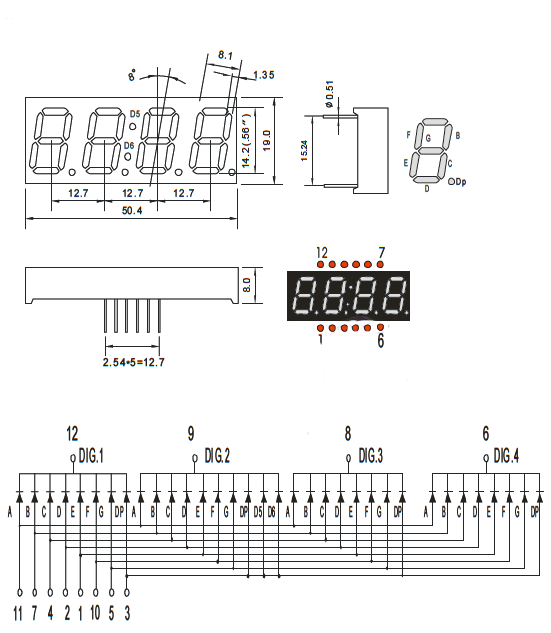 注意:此七段顯示器專門做為時鐘顯示用,只有中間2點會亮,底部4點均不亮。