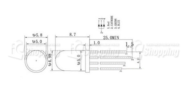 直徑5mm,透明,四腳,腳長25mm,白發紅綠藍三色全彩LED,共陰,高亮發光二極管。