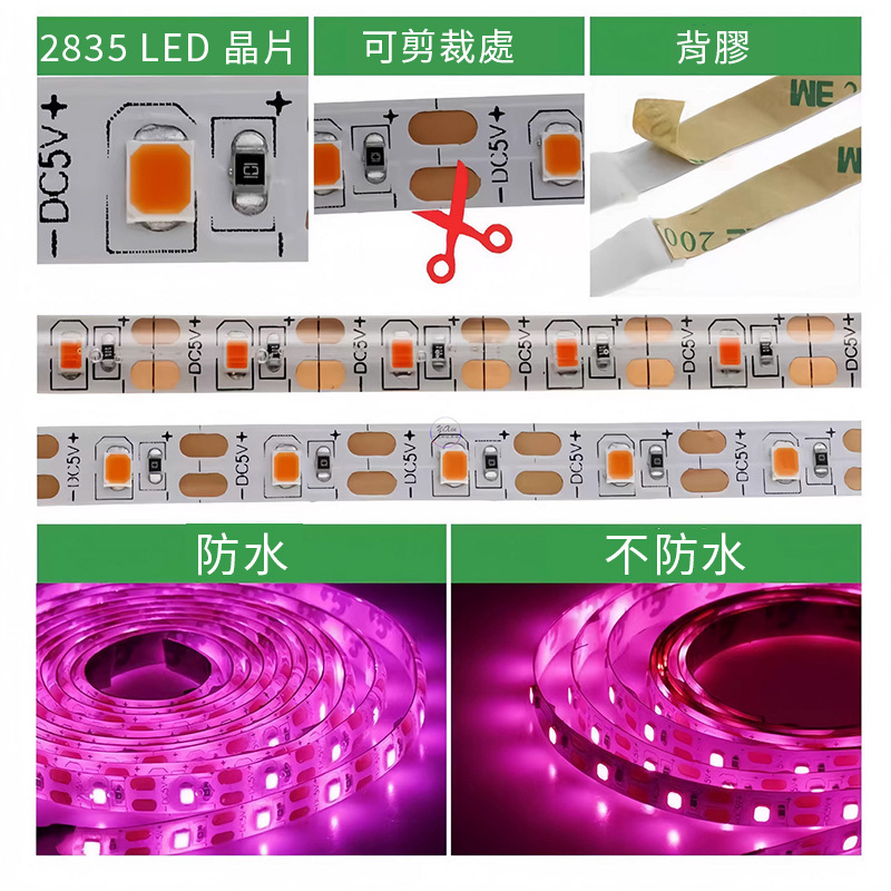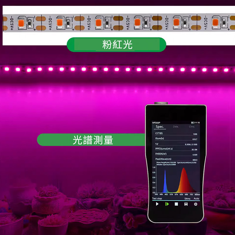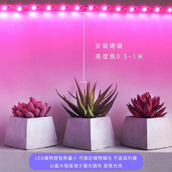 低壓低亮:5V低壓USB頭,1米60珠5瓦,適用於花近近距離光照(<20cm)。安全又省電!燈條必須跟植物離得近。
