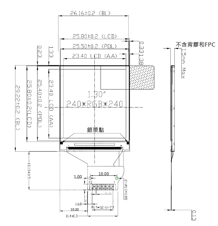 | 面板尺寸 | 26.16(H)x29.22(V)x1.5Max(D) mm | ||
