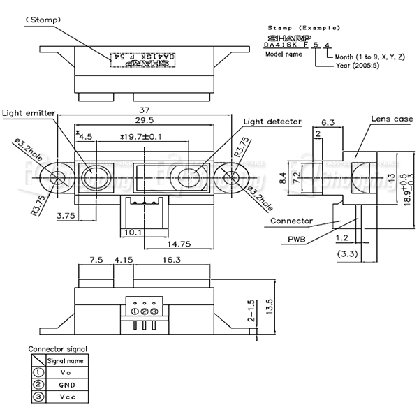 由於採用了三角測量法,物體反射率的變化、環境溫度和工作時長等對距離檢測均不易產生影響。 本裝置輸出與檢測距離對應的電壓。 所以這個感測器也可以用作接近感測器。
