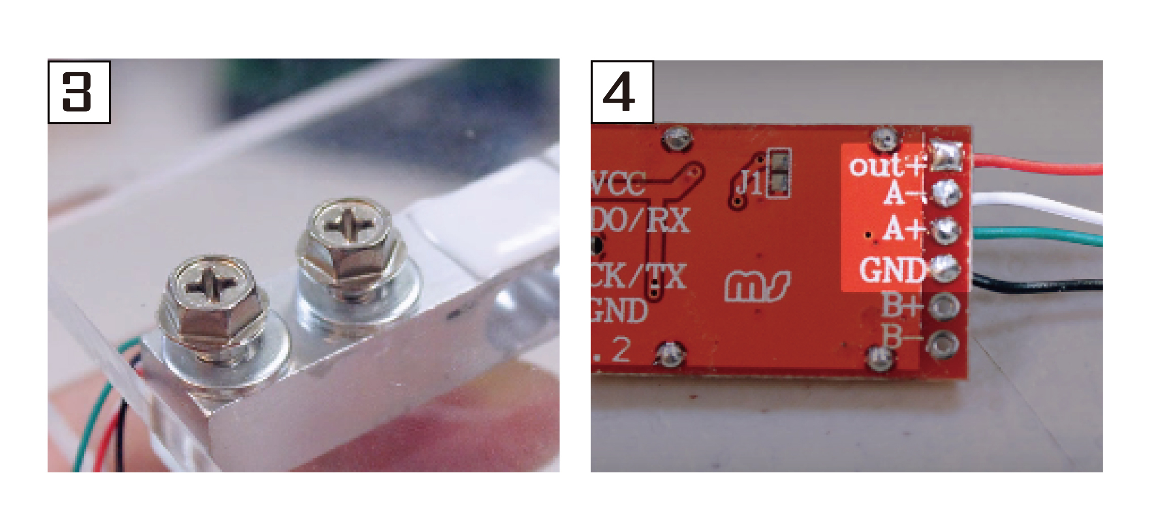 (4) LCD;傳感器上紅、白、綠、黑 的接線分別接到,模組右端的out+、A-、A+、GND