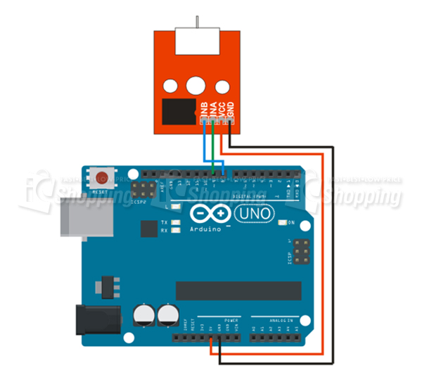 模組的VCC接5V, GND接GND,INA接數位介面9,INB接數位介面8 ,如下圖所示: