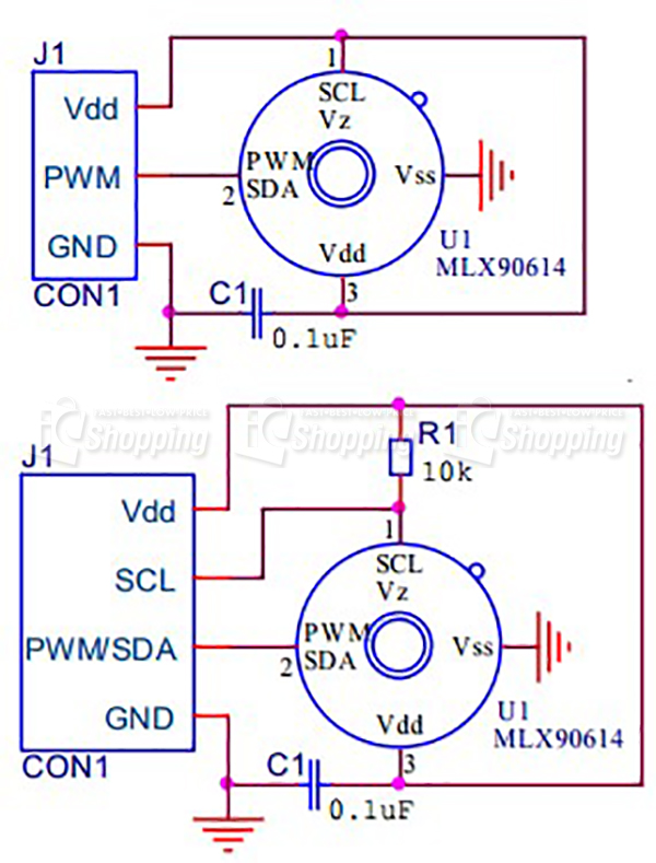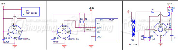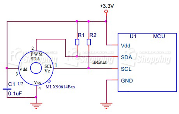 系統允許在兩線上連接多達100個器件。器件本身EEPROM裡存儲的從機位址。PWM 引腳也可配置為熱動繼電器模式,(輸入為被猜測物體溫度) 進而構造簡單且經濟的恒溫器或是溫度(凍結/沸騰)警報裝置,無需MCU。通過內部EEPROM設置閥值和遲滯。MLX90614的輸出不是繼電器驅動,而是邏輯輸出,在必要時該輸出可以連接到繼電器驅動上。在SMBus系統中該特性可以作為進程中斷以便讀取匯流排上的從動器件並確定其精確的狀態。