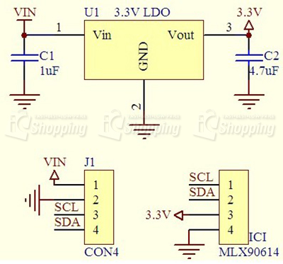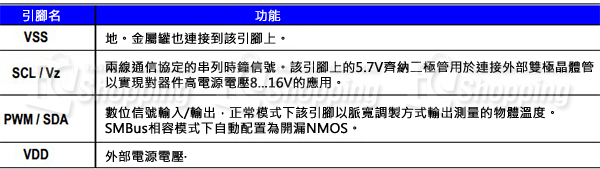 MLX90614是一款由邁來芯公司提供的低成本,無接觸溫度計。輸出資料和物體溫度呈線性比例,具有高精度和高解析度。TO-39金屬封裝裡同時集成了紅外感應熱電堆探測器晶片MLX81101(溫度是通過PTC或是PTAT元件測量)和信號處理專用集成晶片MLX90302,專門用於處理紅外感測器輸出信號。用以阻礙可見光和近紅外光輻射的光學濾波器(可傳播長波)集成在封裝內提供對環境和日光的免疫。濾波器的波長通帶為5.5到14μm。由於集成了低雜訊放大器、17位模數轉換器和強大的數位信號處理晶片 MLX90302,使得高精度和高分辨度的溫度計得以實現。一個附加的片上溫度感測器用來測量晶片的溫度。測量完兩個感測器的輸出後,對應的環境溫度和物體溫度被計算出。計算所得物體溫度和環境溫度存儲在MLX90302的RAM單元,溫度解析度為0.01℃,並可通過兩線 SMBus(系統管理匯流排)相容協定介面(IIC與之相容)(0.02℃解析度)或是10位元PWM(脈寬調製)輸出模式輸出。MLX90614出廠溫度範圍都進行過校準,感測器測量的溫度為視場裡所有物體溫度的平均值。