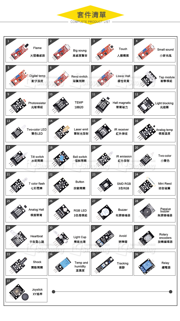 這次我們把大多數學習者要用到的感測器放在一個套裝裡,讓大家一次性就可以獲得37款感測器,方便大家使用和學習。我們為套裝裡的每一款感測器都編寫了資料,讓您學得更方便。