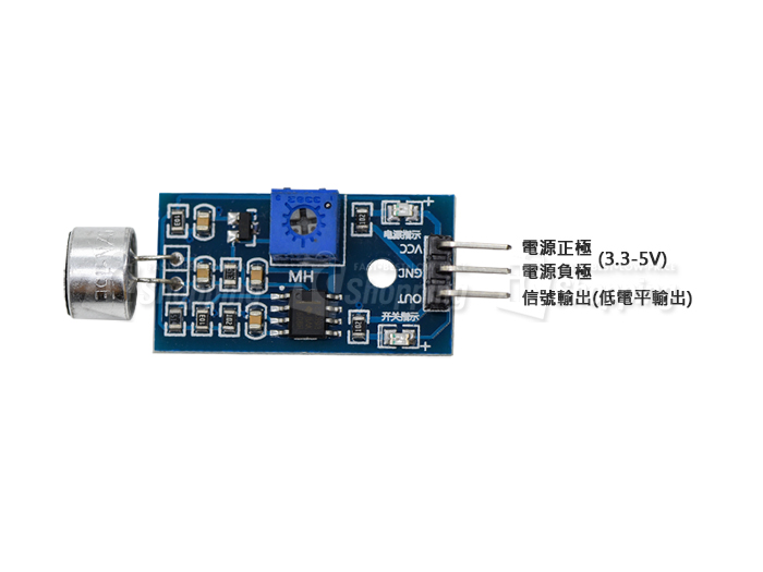 2 模組在環境聲音強度達不到設定閾值時,OUT輸出高電平,當外界環境聲音強度超過設定閾值時,模組OUT輸出低電平;