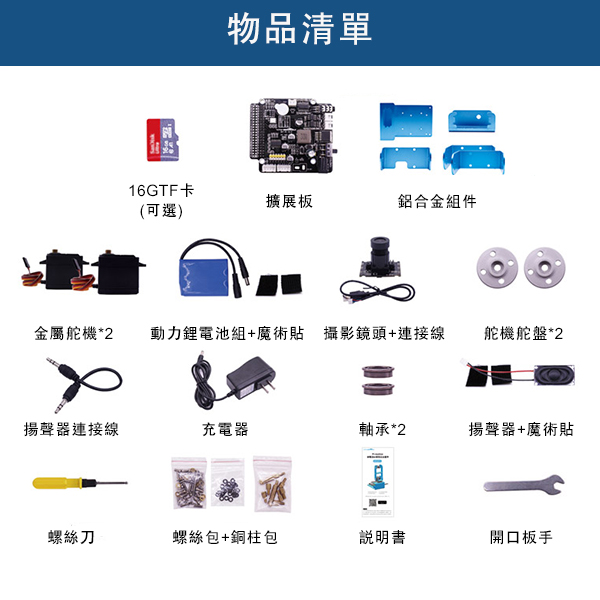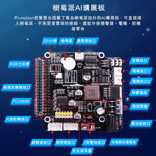 6路舵機接口、RGB小燈、GPIO兩路LED、 |