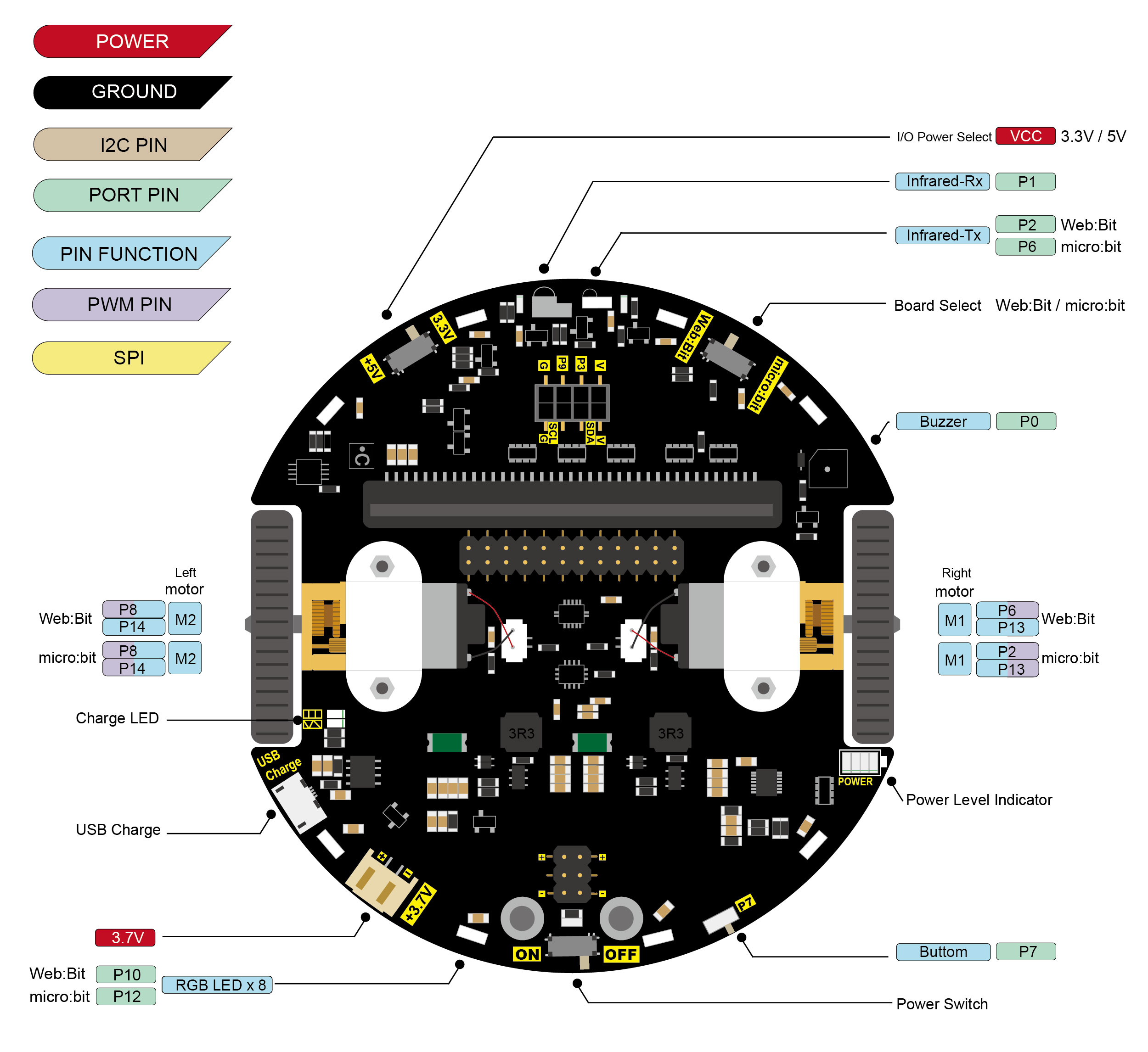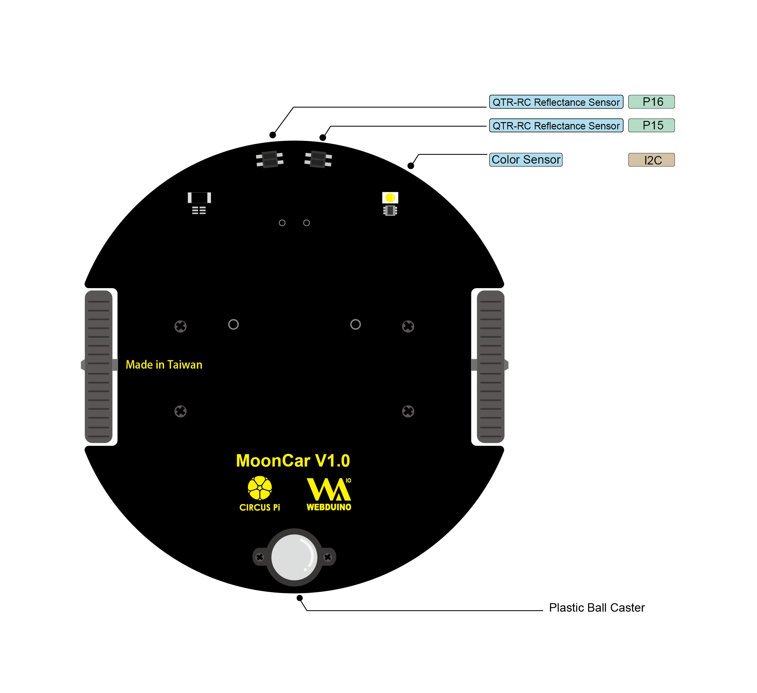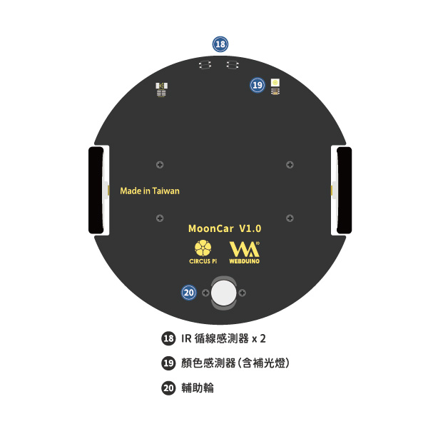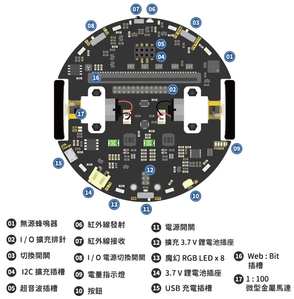 | 板載元件 | 紅外線發射 紅外線接收 無源蜂鳴器 魔幻 RGB LED x8 按鈕開關 循線感測器 x2 高感度顏色感測器 |