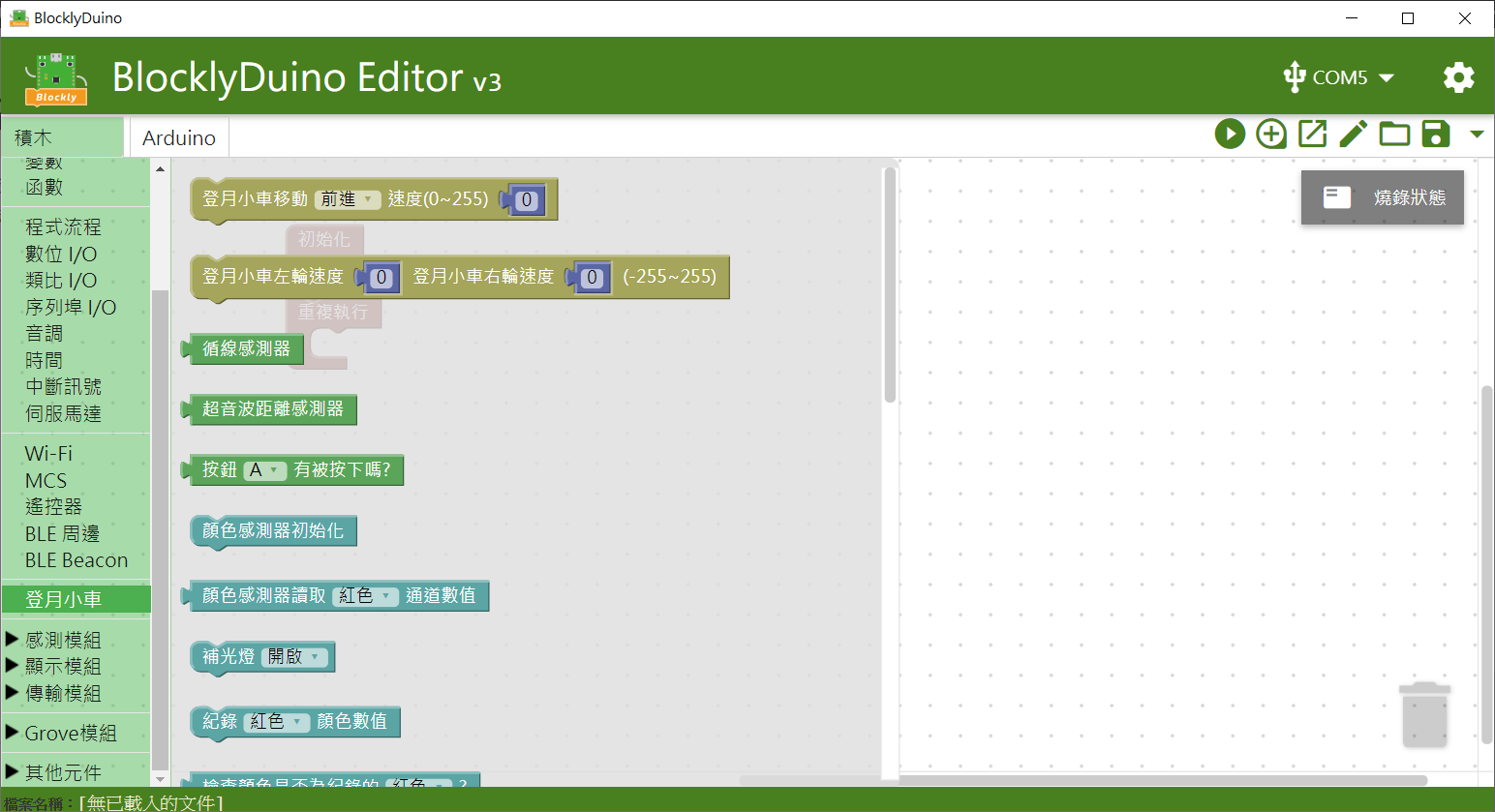 範例程式在example資料夾,打開BlocklyDuino3 並按下右上角有個資料夾圖案(開啟),找到想要開啟的範例程式即可打開。