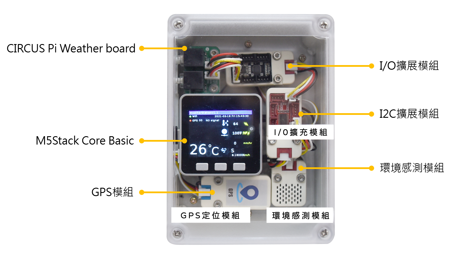 M5Stack IoT 氣象儀是一款跨領域的教學套件,透過 M5Stack CORE Basic 控制核心整合感測器蒐集到的資料,模擬真實氣象觀測站的功能並上傳雲端紀錄,結合資訊科技與地球科學,除了了解大氣中的環境參數對天氣的影響外,藉由雨量計、風速儀與風向儀的設計原理學習基礎電學知識,撰寫資料處理系統了解物聯網與資料庫的通訊應用。