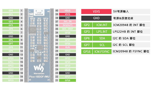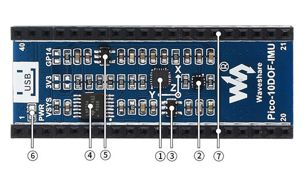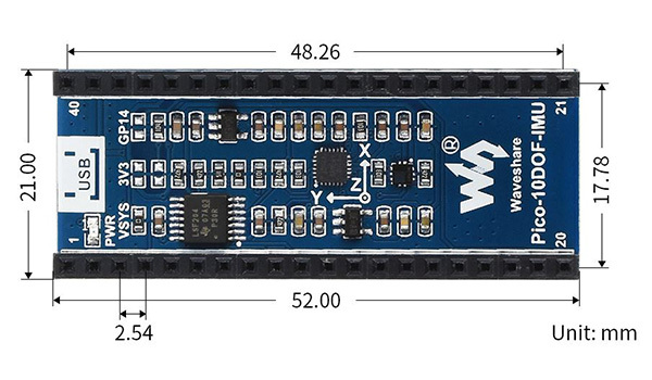 Pico-10DOF-IMU是一款專門為Raspberry Pi Pico設計的感測器擴展板,板載了陀螺儀,加速度計,磁力計,氣壓計等感測器,I2C通訊介面。