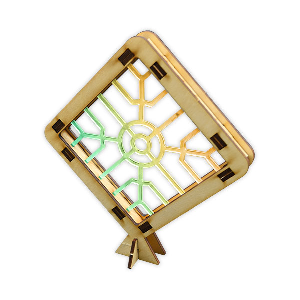這是一款RGB數位窗花,木頭組合件是透過3D建模軟體繪製,再經由雷射切割機製作而成。組裝步驟簡單易懂,組裝完成後可使用迷你3鍵LED幻彩控制器(USB)控制燈色及模式,適合老師於課堂上帶領學生一起學習,或是家長與小孩一同在家裡組裝,讓創意又美觀的數位窗花點綴您的生活。