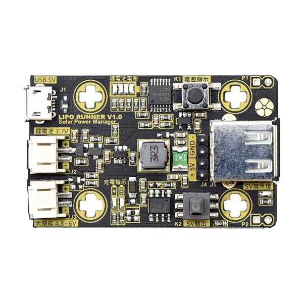 Circus Lipo Runner 是Lipo Rider的增強版。它比Lipo Rider提供更重的負載輸出(1A峰值)。LiPo Rider 板能藉由太陽能運行您最喜愛的5V設備。Circus Lipo Runner 電路板是您室外感測器設計的理想綠色電源解決方案。將Circus Lipo Runner 板連接到您的感測器板上,它可以永久運行在太陽能上!它也可以用來給手機充電。