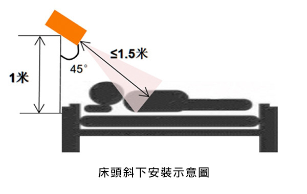 針對睡眠呼吸心跳偵測需求,雷達需要採用傾斜安裝方式(如圖 5 所示),雷達要求安裝在床頭正上方 1m 高度,向下傾斜 45°對著床中間,控制雷達與胸腔的距離為 1.5m 範圍內,確保雷達正常進行呼吸心跳以及睡眠相關參數探測。