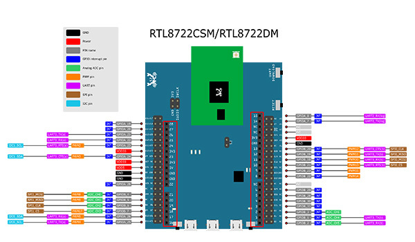 AmebaD的引腳圖和功能請參考下圖和表格。