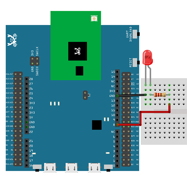 簡而言之,這個範例會使LED不停地閃爍。它使用的是GPIO引腳08(參考引腳圖D08)。我們把LED和電阻連接起來,如下圖所示:(注意:在一個LED中,較長的引腳是正極,較短的引腳是負極。我們將較長的引腳連接到D08,並將較短的引腳連接到GND。另外,請在LED和GND之間串聯一個合適大小的電阻來保護LED)