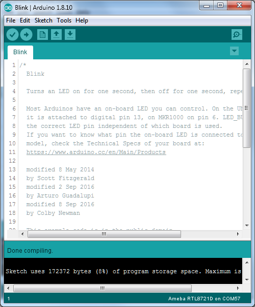 從1.6.5版本開始,Arduino IDE支持第三方硬件。因此,我們可以使用Arduino IDE在AmebaD上開發應用程序,Arduino的範例也可以在AmebaD上運行。 Arduino IDE可以在Arduino網站下載: