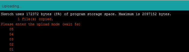 Arduino IDE將首先編譯,然後上傳。在上傳過程中,用戶需要將開發板調至上傳模式。 Arduino IDE會等待5秒鐘,等待開發板進入上傳模式。