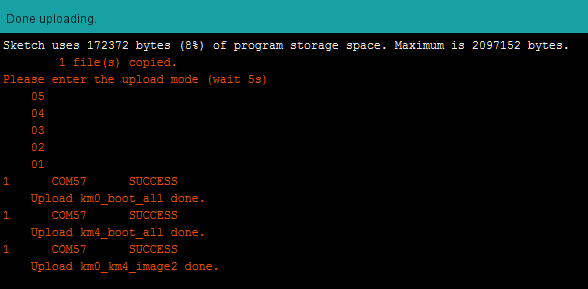 之後,我們將把編譯後的代碼上傳到AmebaD。請確保AmebaD已連接到您的計算機,然後單擊“項目”—>“上傳”