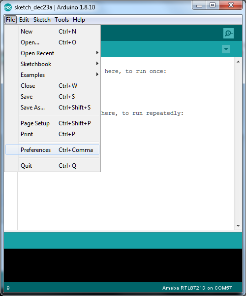 安裝完成後,打開Arduino IDE。為了在Arduino IDE中正常使用AmebaD,請打開“文件”—>“首選項”