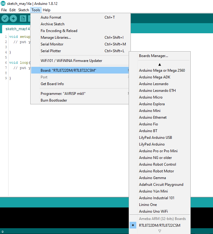 最後,我們在“工具”->“開發板”->“Arduino AmebaD”中選擇了AmebaD作為當前連接的開發板:
