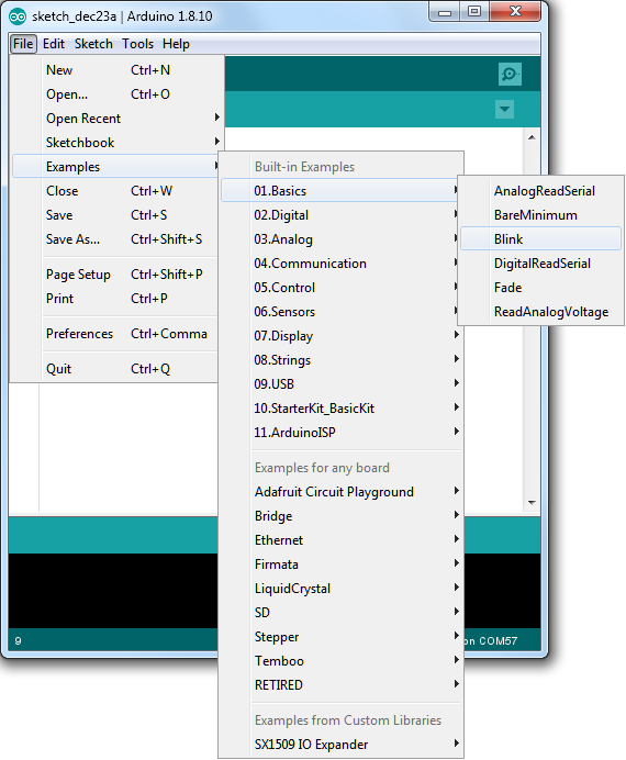 打開“文件”->“範例”->“ 01.Basics”-> “Blink”: