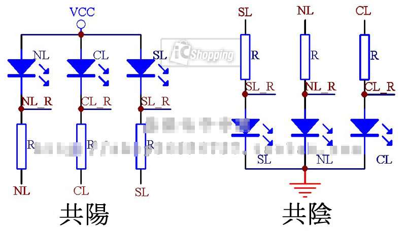 指示燈按公共端不同分共陰和共陽兩種,如下圖