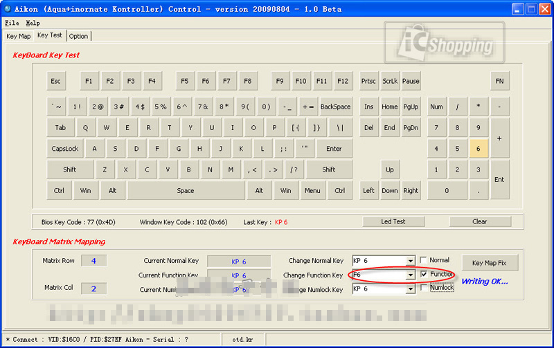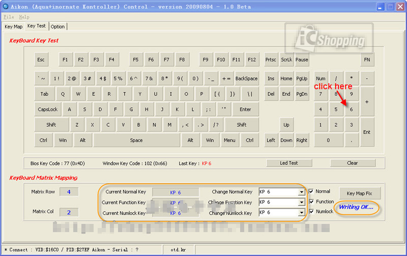 那麼我需要在「按鍵設定區」點擊數字6,軟體會提示"Writing OK",則這個按鍵就設定好了!同時軟體會顯示該按鍵編碼