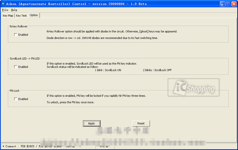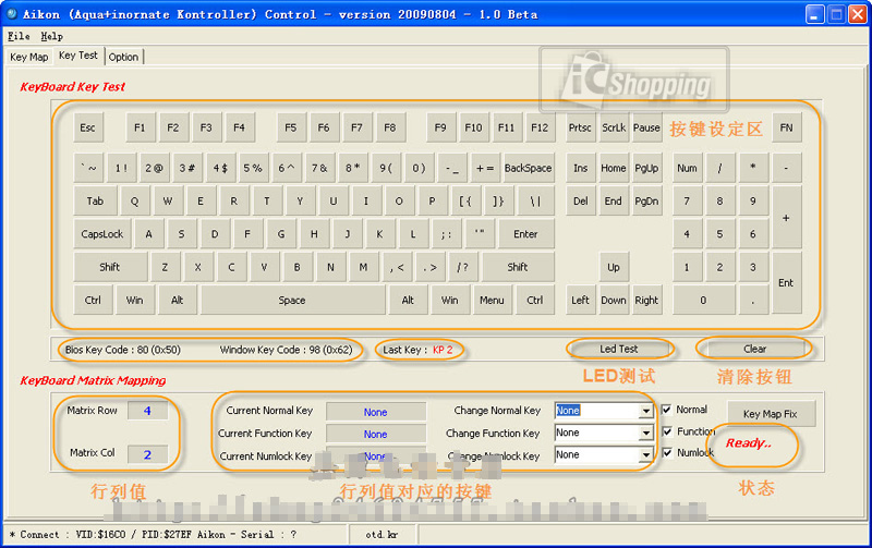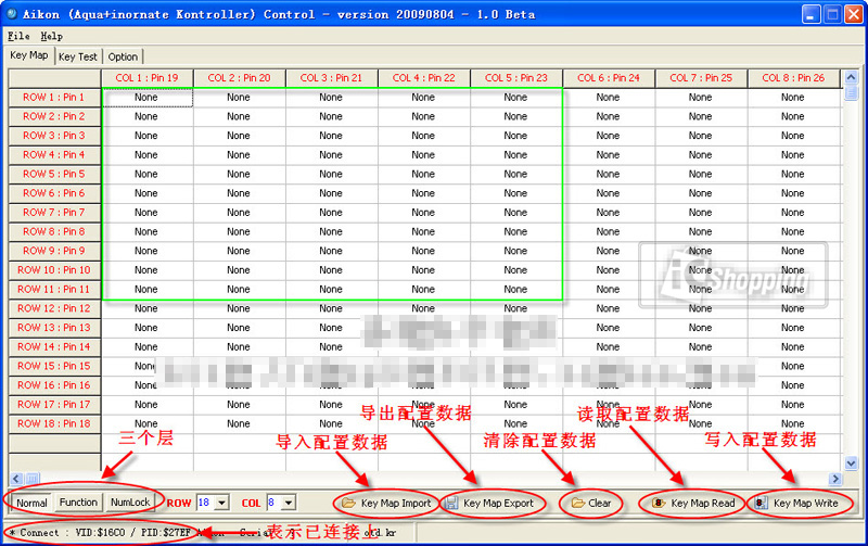打開壓縮包裡面的aikon.exe程序,如果看到左下角顯示「connect」,說明驅動安裝正常,軟體已經找到Monkey了,點擊「Key Map Read」從Monkey讀取配置數據,如下圖