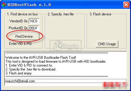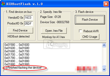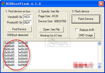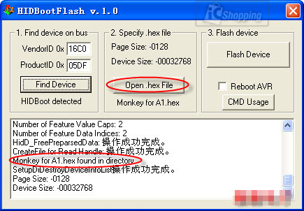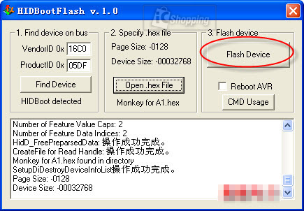 然後把Monkey與電腦連接,Monkey上的L1指示燈將閃爍,如果是裝好的鍵盤,NL,CL,SL三個指示燈也會閃爍,然後打開我們給出的HIDBootFlash軟體,如下圖
