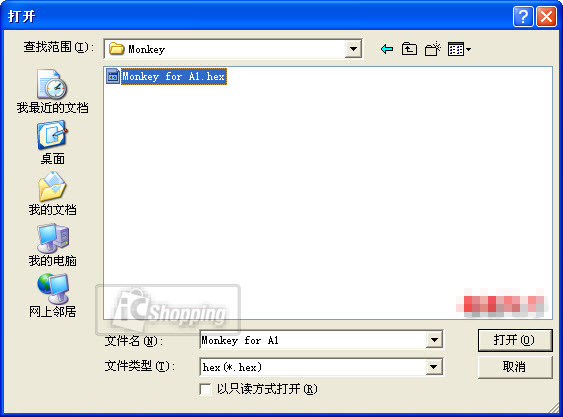 軟體會自動查找到當前目錄下的hex文件,我們也可以手動加載HEX文件,點擊open.hex file,找到要刷新的HEX文件(如下圖為Monkey for A1.hex)