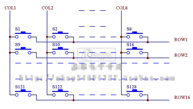 由此我們可以看到,在行線與列線交叉的地方放置一個按鍵(S1~S128),共有128個按鍵可以使用,而且每根列線(標注為ROW)接了16個按鍵,而每根行線(COL)接了8個按鍵,