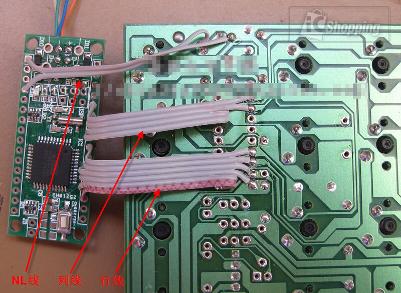 把找到的行列及NL接線焊接到Monkey的ROW,COL(行列小於8的非無沖鍵盤行列可以互換)上