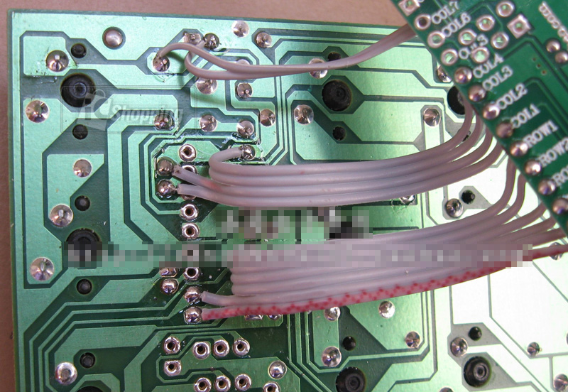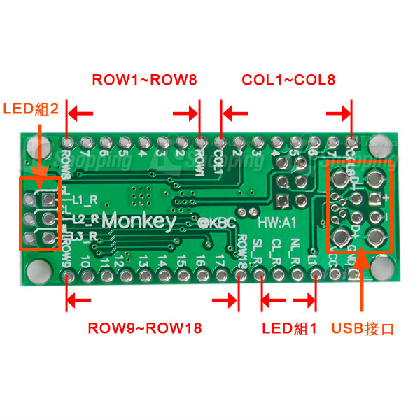 然後通過鍵盤的走線,或者是用萬用表(不要問我怎麼用萬用表-_-!)測量找出行列線,然後把行線接到Monkey上的任意ROWx上,列線接到Monkey的任意COLx上,