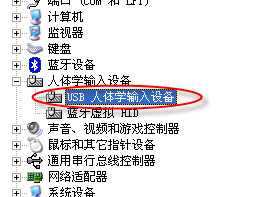 現在把USB線接到Monkey板子上,請按以下定義連接:橙接+,白接-,藍接D+,綠接D-,然後把USB線插到電腦上,如果在設備管理器出現下圖的「USB人體學輸入設備」,