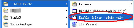 從我們給出的地址下載壓縮包,安裝裡面的libusb-win32-devel-filter-1.2.1.0軟體,一路next就可以了,然後打開開始菜單,找到LibUSB-Win32——>Enable filter(admin only),注意,只有管理員才有此權限!