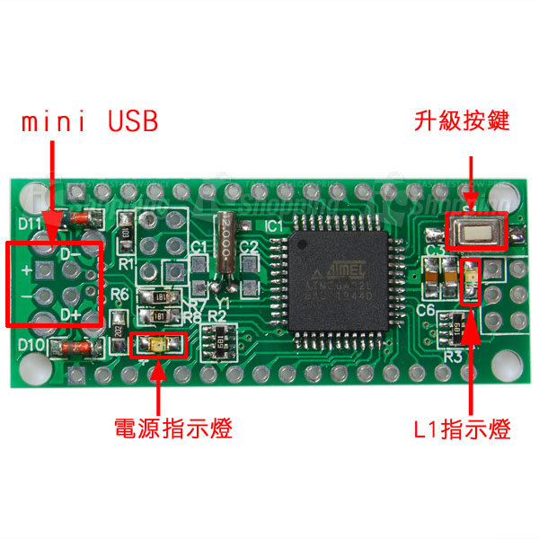 左下角為電源指示燈(紅色),上電正確會常亮,右邊為「L1指示燈」,進入刷新固件模式的時候會閃爍(大概2Hz),