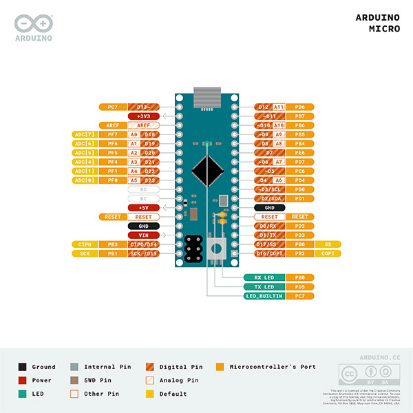 Micro 板與 Arduino Leonardo 的相似之處在於 ATmega32U4 具有內置 USB 通信功能,無需輔助處理器。這使得 Micro 除了虛擬 (CDC) 串行/COM 連接埠外,還可以作為游標和鍵盤出現在連接的電腦上。