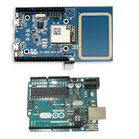 Ameba與Arduino Uno的大小差不多,圖中上方是Ameba,下方則是Arduino Uno,Ameba的針腳與Arduino Uno相容,Ameba右邊多了NFC天線,如果沒用到NFC天線可以將右邊的板子裁掉。