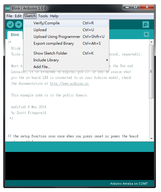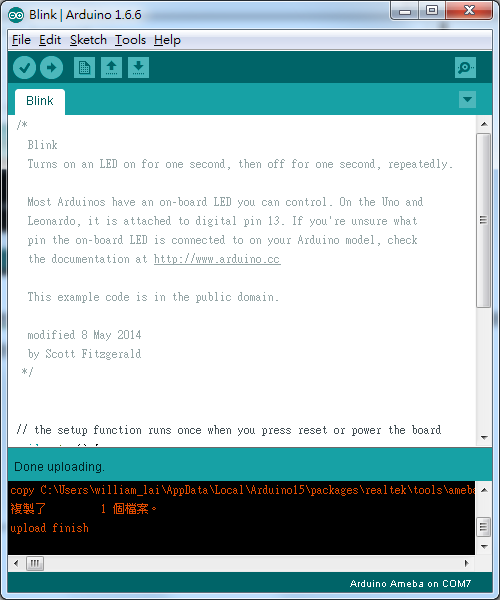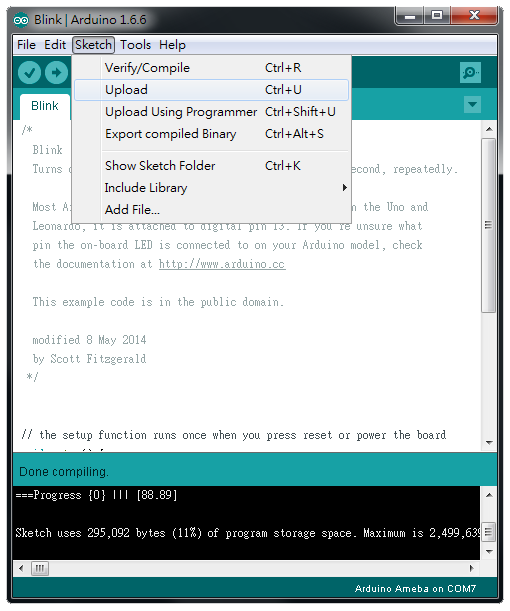接著我們就可以上傳編譯好的程式碼到Ameba上面。先確定Ameba跟電腦之間的線有接上,然後點選 “Sketch” -> “Upload”