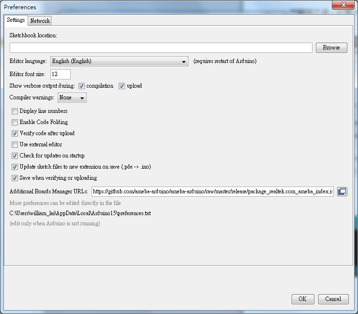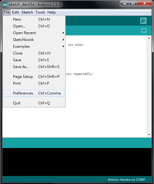 安裝完之後,打開Arduino IDE,為了讓Arduino IDE找到Ameba的設定檔,先到 “File” -> “Preferences”